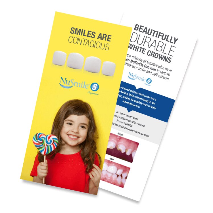 Excellent aid for consultation or for the waiting room. Presented especially for parents, these informative pamphlets contain informative content about NuSmile Signature Pre-veneered anterior esthetic crowns. There are 50 pamphlets per pack.